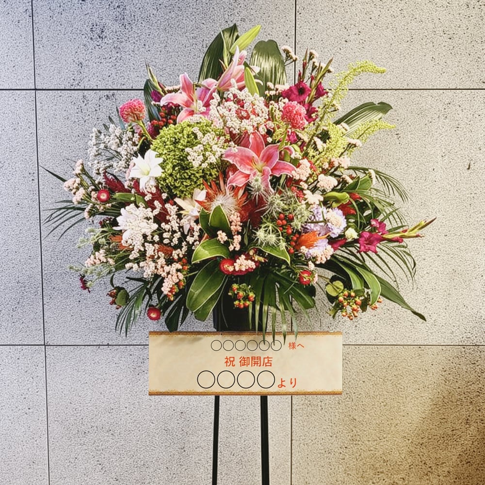 とても華やかで見応えのあるスタンド生花です。お花をふんだんに取り入れたこの商品は、特別な日の演出に最適です。1基1段のスタイルで、立札付きのため、贈り物にもぴったりです。