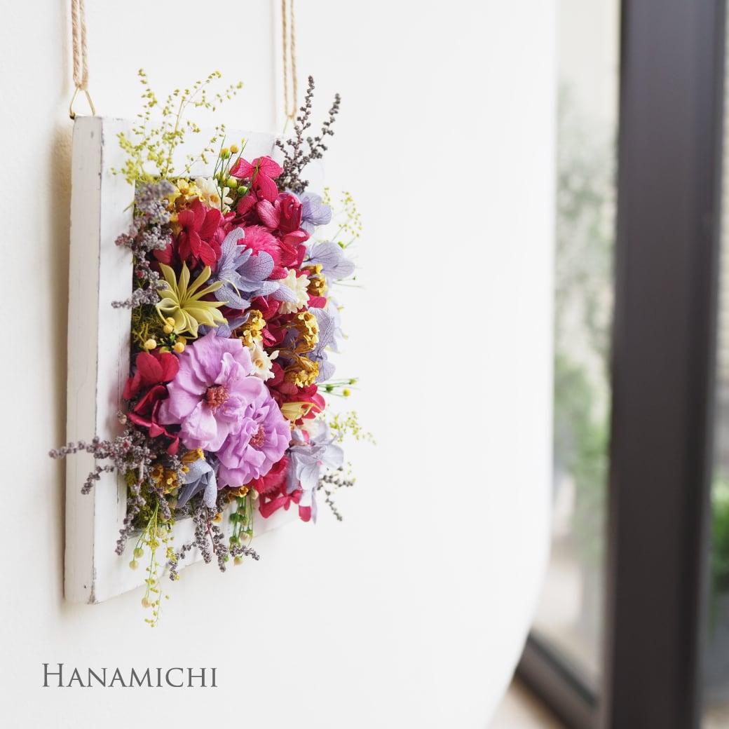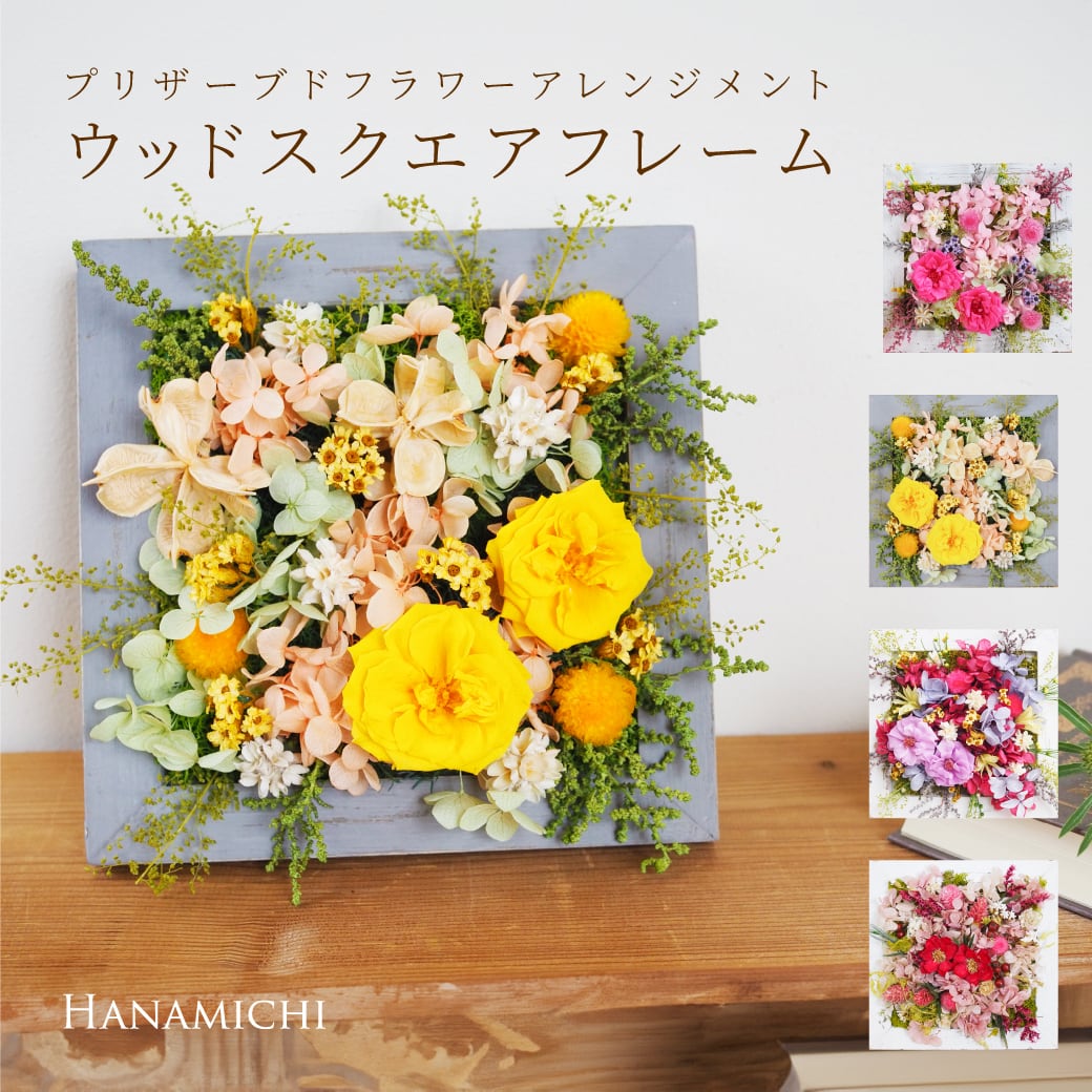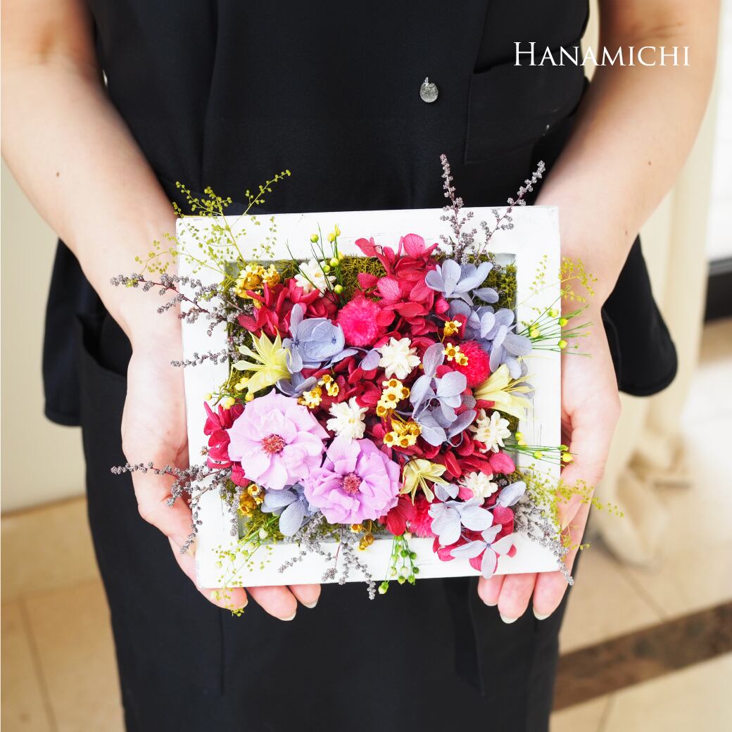 四角いウッドスクエアフレームに、美しいプリザーブドフラワーのアレンジメントを施しました。お部屋の壁に掛けたり、テーブルや棚に置いたりすることができるので、飾り方も自由自在です。洗練されたデザインと上質な素材が、お部屋に上品なアクセントを加えます。
