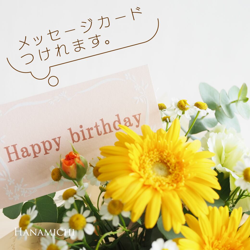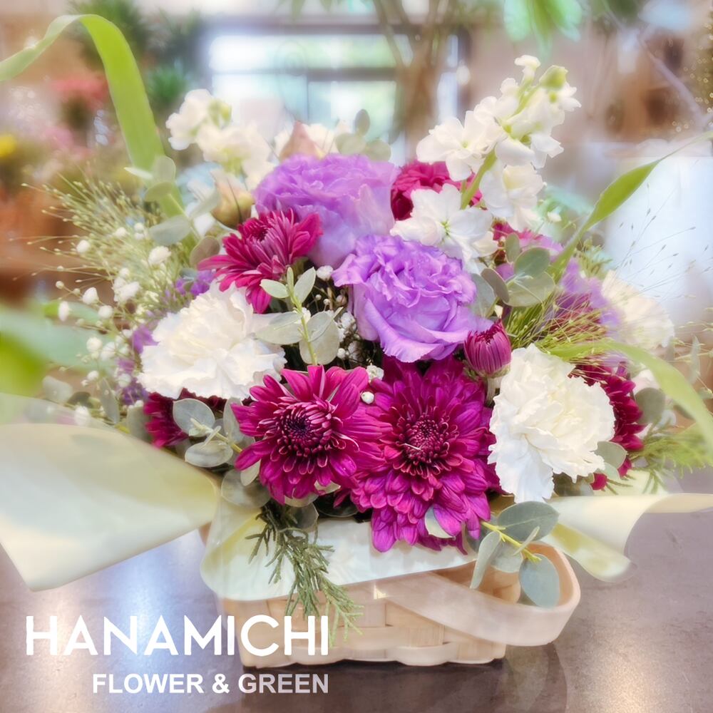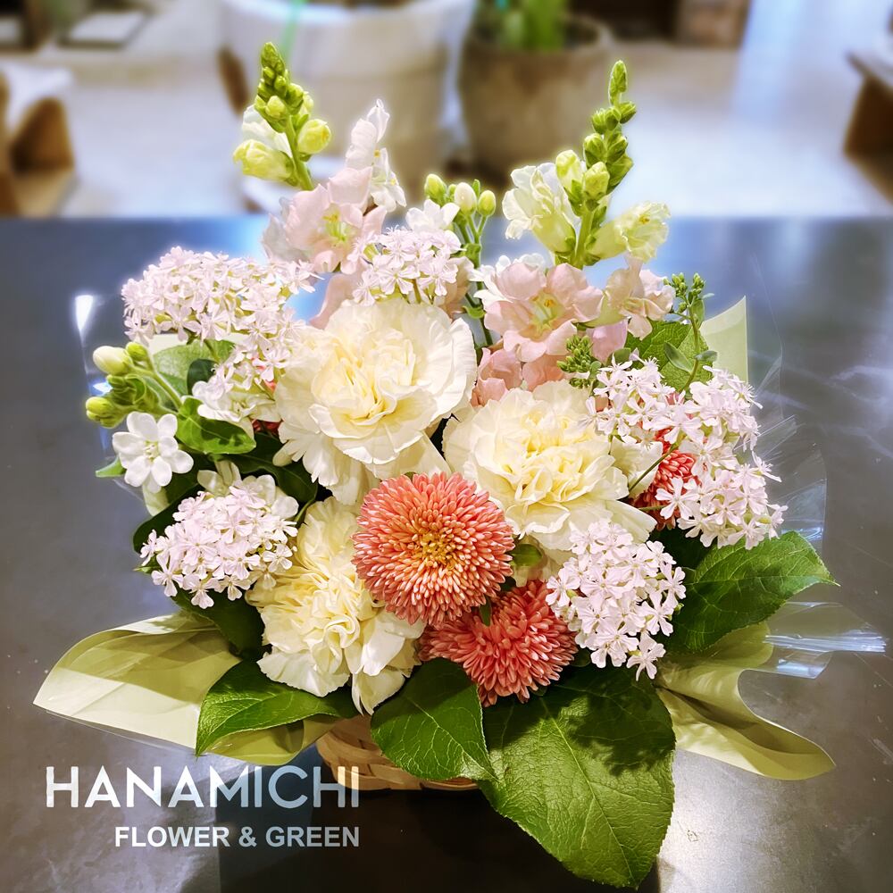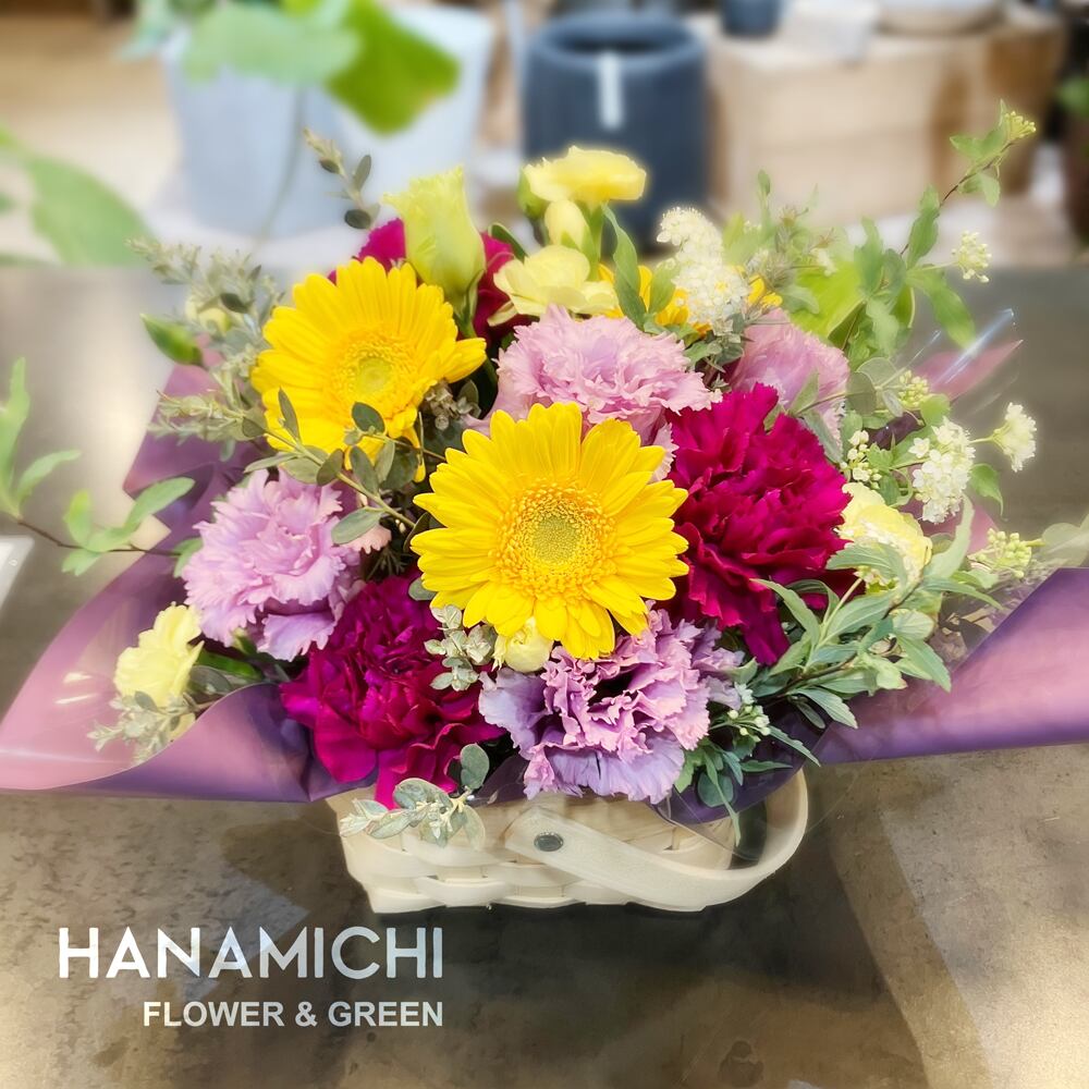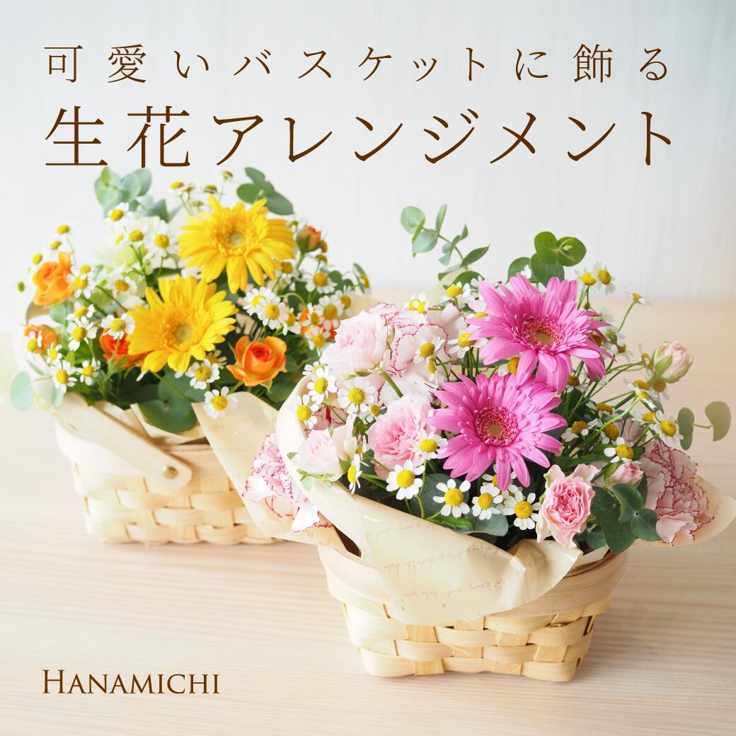 ピンクとイエローの2色から選べる可愛らしいバスケットにアレンジを心をこめてお届けいたします。